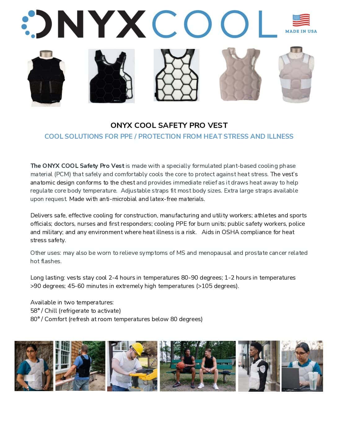 ONYX COOL’s Vest is made with a specially formulated plant-based cooling phase material (PCM) that safely and comfortably cools the core to protect against heat stress, increase stamina and enhance performance. Provides safe, effective cooling for anyone that works hard in the heat: construction, manufacturing and utility workers; athletes and officials; surgeons and operating room nurses; first responders, police and military.